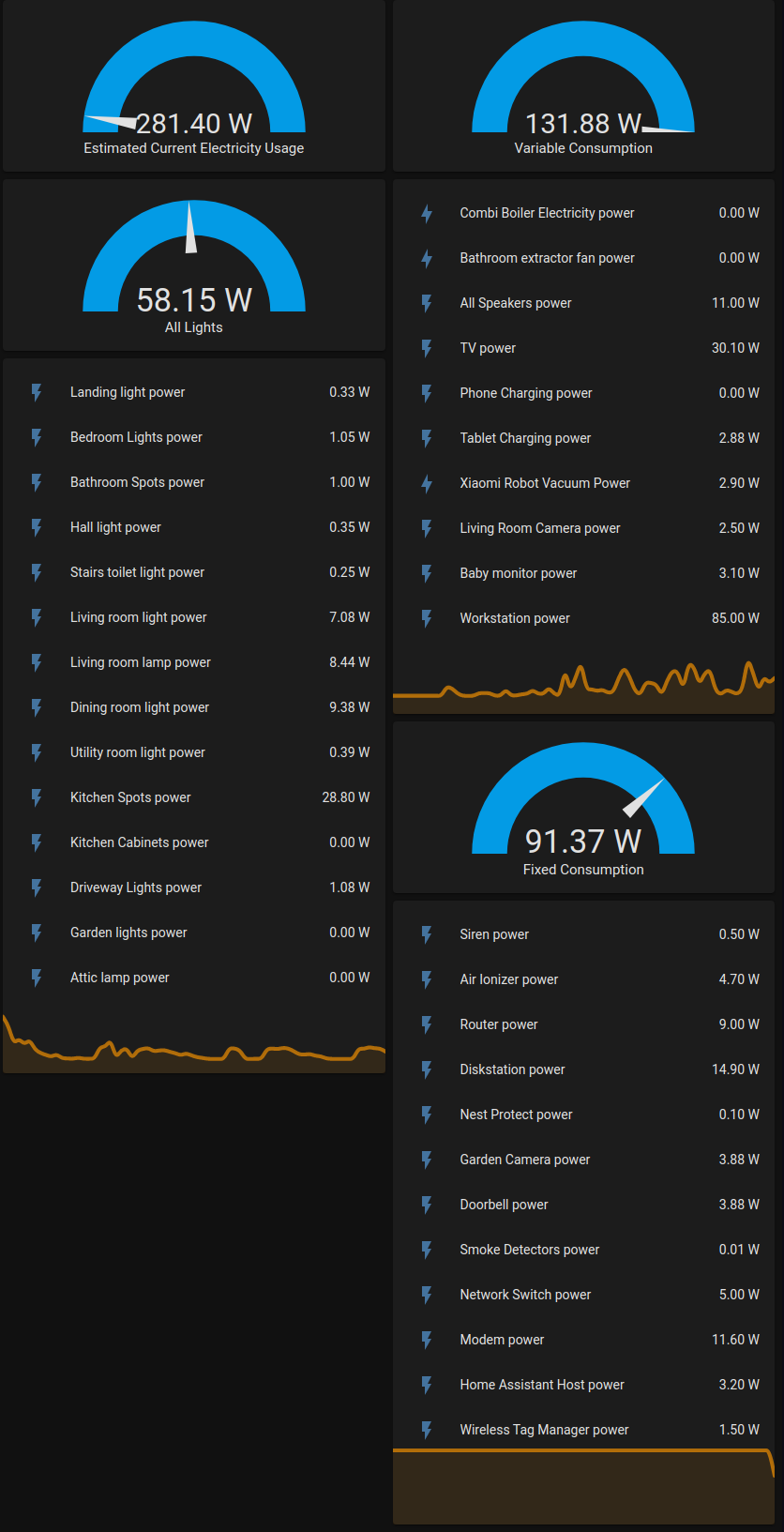 Bram Gerritsen’s Powercalc integration automates the creation of the kind of virtual energy sensors I created above. It is especially powerful when it comes to lights, as it automatically recognises the device and model of popular smart lights and looks up its current state in a community-contributed lookup table to find a good estimate of its current power usage. In my case, it automatically detected every smart light in the house.