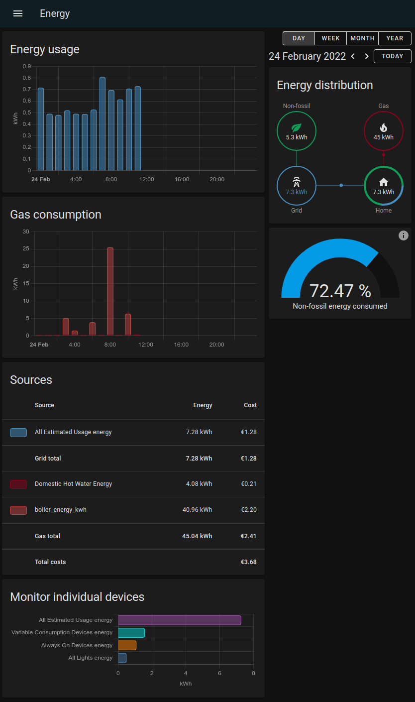My initial goal was to create an virtual energy sensor for my gas boiler, which could be monitored by the energy dashboard: